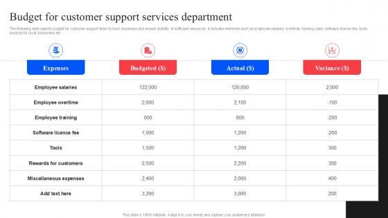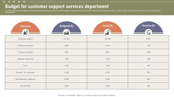 The following slide depicts budget for customer support team to track expenses and ensure stability of sufficient resources. It includes elements such as employee salaries, overtime, training costs, software license fee, tools, rewards for loyal consumers etc. Do you have to make sure that everyone on your team knows about any specific topic I yes, then you should give Budget For Customer Support Services Improving Customer Retention PPT PowerPoint a try. Our experts have put a lot of knowledge and effort into creating this impeccable Budget For Customer Support Services Improving Customer Retention PPT PowerPoint. You can use this template for your upcoming presentations, as the slides are perfect to represent even the tiniest detail. You can download these templates from the Slidegeeks website and these are easy to edit. So grab these today The following slide depicts budget for customer support team to track expenses and ensure stability of sufficient resources. It includes elements such as employee salaries, overtime, training costs, software license fee, tools, rewards for loyal consumers etc.