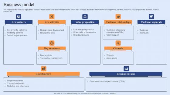 The purpose of this slide is to highlight the business model used to understand the operational details of the company. It includes information related to partners, activities, resources, value propositions, channels, revenue streams, etc. This Business Model Funding Elevator Pitch Deck For Customer Retention Software Structure Pdf is perfect for any presentation, be it in front of clients or colleagues. It is a versatile and stylish solution for organizing your meetings. The Business Model Funding Elevator Pitch Deck For Customer Retention Software Structure Pdf features a modern design for your presentation meetings. The adjustable and customizable slides provide unlimited possibilities for acing up your presentation. Slidegeeks has done all the homework before launching the product for you. So, do not wait, grab the presentation templates today The purpose of this slide is to highlight the business model used to understand the operational details of the company. It includes information related to partners, activities, resources, value propositions, channels, revenue streams, etc.