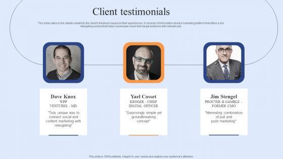 This slide caters to the details related to the clients feedback based on their experiences. It consists of information about a marketing platform that offers a link retargeting service that helps businesses reach their target audience with relevant ads. Welcome to our selection of the Client Testimonials Funding Elevator Pitch Deck For Customer Retention Software Introduction Pdf. These are designed to help you showcase your creativity and bring your sphere to life. Planning and Innovation are essential for any business that is just starting out. This collection contains the designs that you need for your everyday presentations. All of our PowerPoints are 100 percent editable, so you can customize them to suit your needs. This multi purpose template can be used in various situations. Grab these presentation templates today This slide caters to the details related to the clients feedback based on their experiences. It consists of information about a marketing platform that offers a link retargeting service that helps businesses reach their target audience with relevant ads.