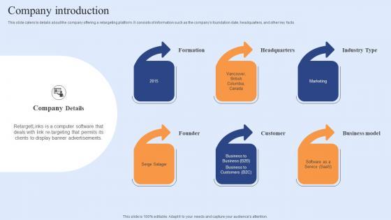 This slide caters to details about the company offering a retargeting platform. It consists of information such as the companys foundation date, headquarters, and other key facts. Explore a selection of the finest Company Introduction Funding Elevator Pitch Deck For Customer Retention Software Slides Pdf here. With a plethora of professionally designed and pre made slide templates, you can quickly and easily find the right one for your upcoming presentation. You can use our Company Introduction Funding Elevator Pitch Deck For Customer Retention Software Slides Pdf to effectively convey your message to a wider audience. Slidegeeks has done a lot of research before preparing these presentation templates. The content can be personalized and the slides are highly editable. Grab templates today from Slidegeeks. This slide caters to details about the company offering a retargeting platform. It consists of information such as the companys foundation date, headquarters, and other key facts.