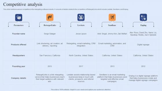 This slide mentions various competitors in the retargeting software industry. It consists of details related to the competitors of RetargetLinks which include Levitate, Sendlane, and Enplug. The best PPT templates are a great way to save time, energy, and resources. Slidegeeks have 100 percent editable powerpoint slides making them incredibly versatile. With these quality presentation templates, you can create a captivating and memorable presentation by combining visually appealing slides and effectively communicating your message. Download Competitive Analysis Funding Elevator Pitch Deck For Customer Retention Software Elements Pdf from Slidegeeks and deliver a wonderful presentation. This slide mentions various competitors in the retargeting software industry. It consists of details related to the competitors of RetargetLinks which include Levitate, Sendlane, and Enplug.