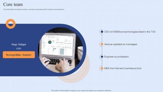 This slide caters to details about key members associated with Companys founding team. Are you searching for a Core Team Funding Elevator Pitch Deck For Customer Retention Software Professional Pdf that is uncluttered, straightforward, and original Its easy to edit, and you can change the colors to suit your personal or business branding. For a presentation that expresses how much effort you have put in, this template is ideal With all of its features, including tables, diagrams, statistics, and lists, its perfect for a business plan presentation. Make your ideas more appealing with these professional slides. Download Core Team Funding Elevator Pitch Deck For Customer Retention Software Professional Pdf from Slidegeeks today. This slide caters to details about key members associated with Companys founding team.