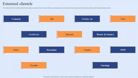 This slide caters to the details related to the esteemed clients of the company offering link retargeting service that helps businesses reach their target audience with relevant advertisements. Retrieve professionally designed Esteemed Clientele Funding Elevator Pitch Deck For Customer Retention Software Background Pdf to effectively convey your message and captivate your listeners. Save time by selecting pre made slideshows that are appropriate for various topics, from business to educational purposes. These themes come in many different styles, from creative to corporate, and all of them are easily adjustable and can be edited quickly. Access them as PowerPoint templates or as Google Slides themes. You do not have to go on a hunt for the perfect presentation because Slidegeeks got you covered from everywhere. This slide caters to the details related to the esteemed clients of the company offering link retargeting service that helps businesses reach their target audience with relevant advertisements.