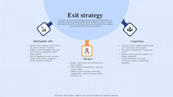 This slide represents exit strategentrepreneur to liquidate their position in a financial asset upon meeting specific criteria, limiting the companys losses, and taking a step back from day to day ies such as launching IPOs, mergers, and acquisitions that enable the operations. Slidegeeks has constructed Exit Strategy Funding Elevator Pitch Deck For Customer Retention Software Icons Pdf after conducting extensive research and examination. These presentation templates are constantly being generated and modified based on user preferences and critiques from editors. Here, you will find the most attractive templates for a range of purposes while taking into account ratings and remarks from users regarding the content. This is an excellent jumping off point to explore our content and will give new users an insight into our top notch PowerPoint Templates. This slide represents exit strategentrepreneur to liquidate their position in a financial asset upon meeting specific criteria, limiting the companys losses, and taking a step back from day to day ies such as launching IPOs, mergers, and acquisitions that enable the operations.