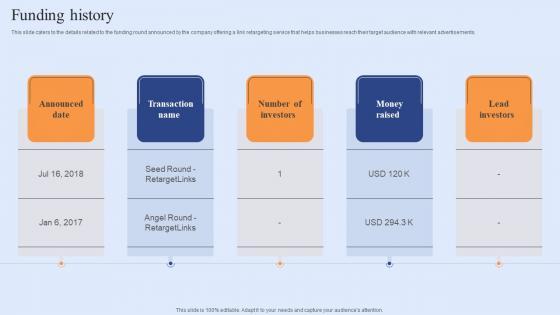 This slide caters to the details related to the funding round announced by the company offering a link retargeting service that helps businesses reach their target audience with relevant advertisements. This Funding History Funding Elevator Pitch Deck For Customer Retention Software Infographics Pdf from Slidegeeks makes it easy to present information on your topic with precision. It provides customization options, so you can make changes to the colors, design, graphics, or any other component to create a unique layout. It is also available for immediate download, so you can begin using it right away. Slidegeeks has done good research to ensure that you have everything you need to make your presentation stand out. Make a name out there for a brilliant performance. This slide caters to the details related to the funding round announced by the company offering a link retargeting service that helps businesses reach their target audience with relevant advertisements.
