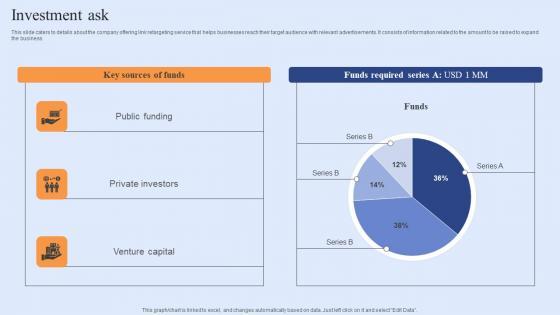 This slide caters to details about the company offering link retargeting service that helps businesses reach their target audience with relevant advertisements. It consists of information related to the amount to be raised to expand the business. Take your projects to the next level with our ultimate collection of Investment Ask Funding Elevator Pitch Deck For Customer Retention Software Ideas Pdf. Slidegeeks has designed a range of layouts that are perfect for representing task or activity duration, keeping track of all your deadlines at a glance. Tailor these designs to your exact needs and give them a truly corporate look with your own brand colors they will make your projects stand out from the rest This slide caters to details about the company offering link retargeting service that helps businesses reach their target audience with relevant advertisements. It consists of information related to the amount to be raised to expand the business.