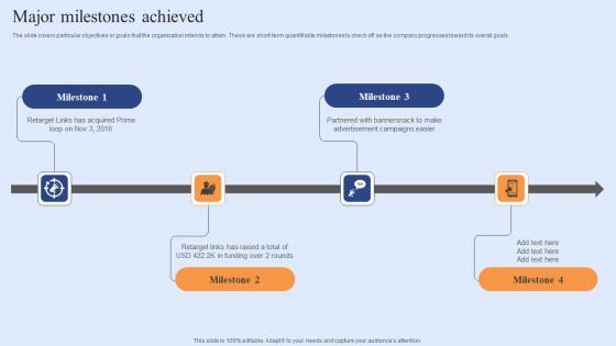 The slide covers particular objectives or goals that the organization intends to attain. These are short term quantifiable milestones to check off as the company progresses toward its overall goals. Find a pre designed and impeccable Major Milestones Achieved Funding Elevator Pitch Deck For Customer Retention Software Download Pdf. The templates can ace your presentation without additional effort. You can download these easy to edit presentation templates to make your presentation stand out from others. So, what are you waiting for Download the template from Slidegeeks today and give a unique touch to your presentation. The slide covers particular objectives or goals that the organization intends to attain. These are short term quantifiable milestones to check off as the company progresses toward its overall goals.