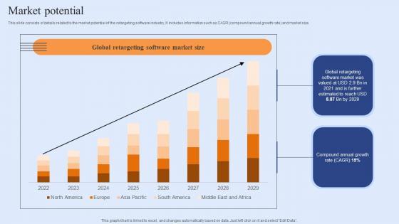 This slide consists of details related to the market potential of the retargeting software industry. It includes information such as CAGR compound annual growth rate and market size. Boost your pitch with our creative Market Potential Funding Elevator Pitch Deck For Customer Retention Software Microsoft Pdf. Deliver an awe inspiring pitch that will mesmerize everyone. Using these presentation templates you will surely catch everyones attention. You can browse the ppts collection on our website. We have researchers who are experts at creating the right content for the templates. So you do not have to invest time in any additional work. Just grab the template now and use them. This slide consists of details related to the market potential of the retargeting software industry. It includes information such as CAGR compound annual growth rate and market size.