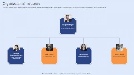 This slide caters to details about key people associated with company leadership including details about CEO chief executive officer, business development head, development lead, etc. Create an editable Organizational Structure Funding Elevator Pitch Deck For Customer Retention Software Icons Pdf that communicates your idea and engages your audience. Whether you are presenting a business or an educational presentation, pre designed presentation templates help save time. Organizational Structure Funding Elevator Pitch Deck For Customer Retention Software Icons Pdf is highly customizable and very easy to edit, covering many different styles from creative to business presentations. Slidegeeks has creative team members who have crafted amazing templates. So, go and get them without any delay. This slide caters to details about key people associated with company leadership including details about CEO chief executive officer, business development head, development lead, etc.