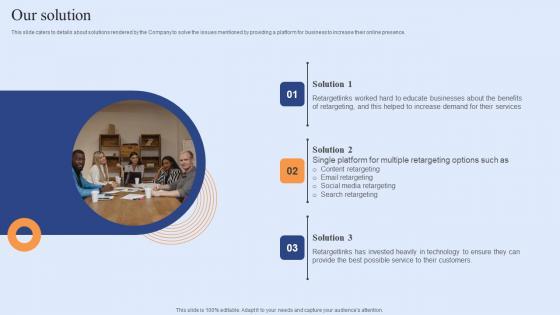 This slide caters to details about solutions rendered by the Company to solve the issues mentioned by providing a platform for business to increase their online presence. Slidegeeks is one of the best resources for PowerPoint templates. You can download easily and regulate Our Solution Funding Elevator Pitch Deck For Customer Retention Software Themes Pdf for your personal presentations from our wonderful collection. A few clicks is all it takes to discover and get the most relevant and appropriate templates. Use our Templates to add a unique zing and appeal to your presentation and meetings. All the slides are easy to edit and you can use them even for advertisement purposes. This slide caters to details about solutions rendered by the Company to solve the issues mentioned by providing a platform for business to increase their online presence.