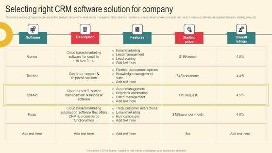 This slide provides glimpse about comparative analysis of customer relationship management tools that can help the business to track and record customer leads. It includes software, description, features, starting price, etc. Present like a pro with Selecting Right CRM Software Marketing Plan For Boosting Client Retention In Retail Banking Designs Pdf Create beautiful presentations together with your team, using our easy to use presentation slides. Share your ideas in real time and make changes on the fly by downloading our templates. So whether you are in the office, on the go, or in a remote location, you can stay in sync with your team and present your ideas with confidence. With Slidegeeks presentation got a whole lot easier. Grab these presentations today. This slide provides glimpse about comparative analysis of customer relationship management tools that can help the business to track and record customer leads. It includes software, description, features, starting price, etc.