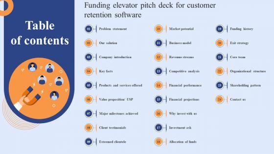 From laying roadmaps to briefing everything in detail, our templates are perfect for you. You can set the stage with your presentation slides. All you have to do is download these easy to edit and customizable templates. Table Of Contents Funding Elevator Pitch Deck For Customer Retention Software Microsoft Pdf will help you deliver an outstanding performance that everyone would remember and praise you for. Do download this presentation today. Our Table Of Contents Funding Elevator Pitch Deck For Customer Retention Software Microsoft Pdf are topically designed to provide an attractive backdrop to any subject. Use them to look like a presentation pro.