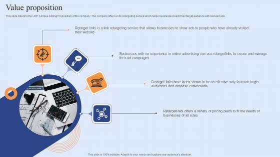 This slide caters to the USP Unique Selling Proposition of the company. The company offers a link retargeting service which helps businesses reach their target audience with relevant ads. Present like a pro with Value Proposition Funding Elevator Pitch Deck For Customer Retention Software Diagrams Pdf Create beautiful presentations together with your team, using our easy to use presentation slides. Share your ideas in real time and make changes on the fly by downloading our templates. So whether you are in the office, on the go, or in a remote location, you can stay in sync with your team and present your ideas with confidence. With Slidegeeks presentation got a whole lot easier. Grab these presentations today. This slide caters to the USP Unique Selling Proposition of the company. The company offers a link retargeting service which helps businesses reach their target audience with relevant ads.