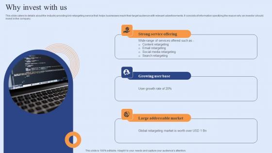 This slide caters to details about the industry providing link retargeting service that helps businesses reach their target audience with relevant advertisements. It consists of information specifying the reason why an investor should invest in the company. Slidegeeks is here to make your presentations a breeze with Why Invest With Us Funding Elevator Pitch Deck For Customer Retention Software Pictures Pdf With our easy to use and customizable templates, you can focus on delivering your ideas rather than worrying about formatting. With a variety of designs to choose from, you are sure to find one that suits your needs. And with animations and unique photos, illustrations, and fonts, you can make your presentation pop. So whether you are giving a sales pitch or presenting to the board, make sure to check out Slidegeeks first This slide caters to details about the industry providing link retargeting service that helps businesses reach their target audience with relevant advertisements. It consists of information specifying the reason why an investor should invest in the company.