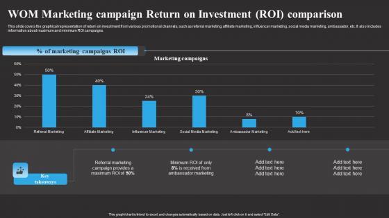 This slide covers the graphical representation of return on investment from various promotional channels, such as referral marketing, affiliate marketing, influencer marketing, social media marketing, ambassador, etc. It also includes information about maximum and minimum ROI campaigns. Present like a pro with Wom Marketing Campaign Return On Tracking Word Mouth Marketing Download PDF Create beautiful presentations together with your team, using our easy-to-use presentation slides. Share your ideas in real-time and make changes on the fly by downloading our templates. So whether you are in the office, on the go, or in a remote location, you can stay in sync with your team and present your ideas with confidence. With Slidegeeks presentation got a whole lot easier. Grab these presentations today. This slide covers the graphical representation of return on investment from various promotional channels, such as referral marketing, affiliate marketing, influencer marketing, social media marketing, ambassador, etc. It also includes information about maximum and minimum ROI campaigns.