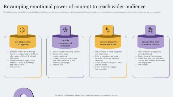 This slide provides information regarding initiatives to enhance emotional power of content by developing sense of urgency, enable engagement of senses, colors usage to evoke emotion, ensure two-way communicationThis Comprehensive Promotion Guidelines To Administer Brand Revamping Emotional Power Of Content To Reach Inspiration PDF from Slidegeeks makes it easy to present information on your topic with precision. It provides customization options, so you can make changes to the colors, design, graphics, or any other component to create a unique layout. It is also available for immediate download, so you can begin using it right away. Slidegeeks has done good research to ensure that you have everything you need to make your presentation stand out. Make a name out there for a brilliant performance.