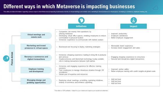 This slide provides information regarding various ways in which Metaverse is impacting businesses in terms of virtual meetings and remote work, marketing and brand presence in virtual space, revamping e-commerce, employee training, etc. The Different Ways In Which Metaverse Is Impacting Continuum Of Technology Revamping Business AI SS V is a compilation of the most recent design trends as a series of slides. It is suitable for any subject or industry presentation, containing attractive visuals and photo spots for businesses to clearly express their messages. This template contains a variety of slides for the user to input data, such as structures to contrast two elements, bullet points, and slides for written information. Slidegeeks is prepared to create an impression. This slide provides information regarding various ways in which Metaverse is impacting businesses in terms of virtual meetings and remote work, marketing and brand presence in virtual space, revamping e-commerce, employee training, etc.