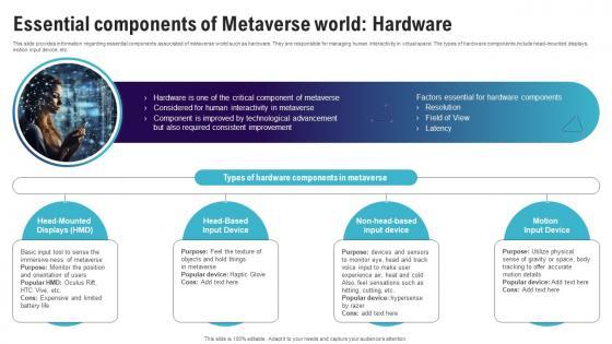 This slide provides information regarding essential components associated of metaverse world such as hardware. They are responsible for managing human interactivity in virtual space. The types of hardware components include head-mounted displays, motion input device, etc. Slidegeeks has constructed Essential Components Of Metaverse Continuum Of Technology Revamping Business AI SS V after conducting extensive research and examination. These presentation templates are constantly being generated and modified based on user preferences and critiques from editors. Here, you will find the most attractive templates for a range of purposes while taking into account ratings and remarks from users regarding the content. This is an excellent jumping-off point to explore our content and will give new users an insight into our top-notch PowerPoint Templates. This slide provides information regarding essential components associated of metaverse world such as hardware. They are responsible for managing human interactivity in virtual space. The types of hardware components include head-mounted displays, motion input device, etc.