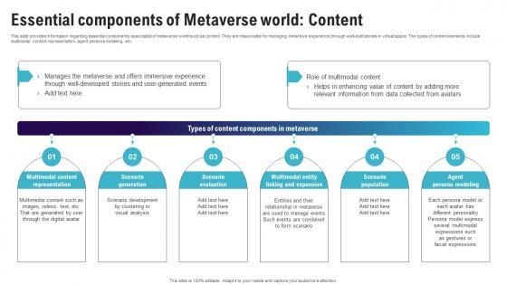 This slide provides information regarding essential components associated of metaverse world such as content. They are responsible for managing immersive experience through well-built stories in virtual space. The types of content elements include multimodal content representation, agent persona modeling, etc. Presenting this PowerPoint presentation, titled Essential Components Of Metaverse World Continuum Of Technology Revamping Business AI SS V, with topics curated by our researchers after extensive research. This editable presentation is available for immediate download and provides attractive features when used. Download now and captivate your audience. Presenting this Essential Components Of Metaverse World Continuum Of Technology Revamping Business AI SS V. Our researchers have carefully researched and created these slides with all aspects taken into consideration. This is a completely customizable Essential Components Of Metaverse World Continuum Of Technology Revamping Business AI SS V that is available for immediate downloading. Download now and make an impact on your audience. Highlight the attractive features available with our PPTs. This slide provides information regarding essential components associated of metaverse world such as content. They are responsible for managing immersive experience through well-built stories in virtual space. The types of content elements include multimodal content representation, agent persona modeling, etc.