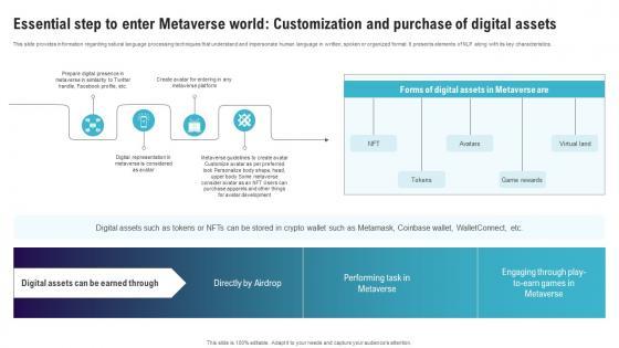 This slide provides information regarding natural language processing techniques that understand and impersonate human language in written, spoken or organized format. It presents elements of NLP along with its key characteristics. Presenting this PowerPoint presentation, titled Essential Step To Enter Metaverse World Purchase Continuum Of Technology Revamping Business AI SS V, with topics curated by our researchers after extensive research. This editable presentation is available for immediate download and provides attractive features when used. Download now and captivate your audience. Presenting this Essential Step To Enter Metaverse World Purchase Continuum Of Technology Revamping Business AI SS V. Our researchers have carefully researched and created these slides with all aspects taken into consideration. This is a completely customizable Essential Step To Enter Metaverse World Purchase Continuum Of Technology Revamping Business AI SS V that is available for immediate downloading. Download now and make an impact on your audience. Highlight the attractive features available with our PPTs. This slide provides information regarding natural language processing techniques that understand and impersonate human language in written, spoken or organized format. It presents elements of NLP along with its key characteristics.