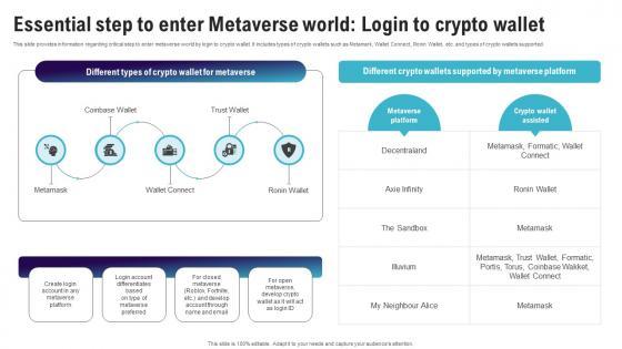 This slide provides information regarding critical step to enter metaverse world by login to crypto wallet. It includes types of crypto wallets such as Metamark, Wallet Connect, Ronin Wallet, etc. and types of crypto wallets supported. Do you know about Slidesgeeks Essential Step To Enter Metaverse World Login Continuum Of Technology Revamping Business AI SS V These are perfect for delivering any kind od presentation. Using it, create PowerPoint presentations that communicate your ideas and engage audiences. Save time and effort by using our pre-designed presentation templates that are perfect for a wide range of topic. Our vast selection of designs covers a range of styles, from creative to business, and are all highly customizable and easy to edit. Download as a PowerPoint template or use them as Google Slides themes. This slide provides information regarding critical step to enter metaverse world by login to crypto wallet. It includes types of crypto wallets such as Metamark, Wallet Connect, Ronin Wallet, etc. and types of crypto wallets supported.