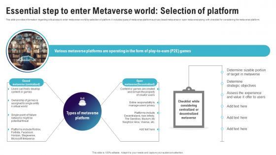 This slide provides information regarding critical step to enter metaverse world by selection of platform. It includes types of metaverse platform such as closed metaverse or open metaverse along with checklist for considering the metaverse platform. Here you can discover an assortment of the finest PowerPoint and Google Slides templates. With these templates, you can create presentations for a variety of purposes while simultaneously providing your audience with an eye-catching visual experience. Download Essential Step To Enter Metaverse World Selection Continuum Of Technology Revamping Business AI SS V to deliver an impeccable presentation. These templates will make your job of preparing presentations much quicker, yet still, maintain a high level of quality. Slidegeeks has experienced researchers who prepare these templates and write high-quality content for you. Later on, you can personalize the content by editing the Essential Step To Enter Metaverse World Selection Continuum Of Technology Revamping Business AI SS V. This slide provides information regarding critical step to enter metaverse world by selection of platform. It includes types of metaverse platform such as closed metaverse or open metaverse along with checklist for considering the metaverse platform.