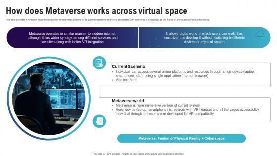 This slide provides information regarding execution of metaverse in terms of its current operations and world associated with metaverse. It is depicted as the fusion of physical reality and cyberspace. Here you can discover an assortment of the finest PowerPoint and Google Slides templates. With these templates, you can create presentations for a variety of purposes while simultaneously providing your audience with an eye-catching visual experience. Download How Does Metaverse Works Across Virtual Space Continuum Of Technology Revamping Business AI SS V to deliver an impeccable presentation. These templates will make your job of preparing presentations much quicker, yet still, maintain a high level of quality. Slidegeeks has experienced researchers who prepare these templates and write high-quality content for you. Later on, you can personalize the content by editing the How Does Metaverse Works Across Virtual Space Continuum Of Technology Revamping Business AI SS V. This slide provides information regarding execution of metaverse in terms of its current operations and world associated with metaverse. It is depicted as the fusion of physical reality and cyberspace.