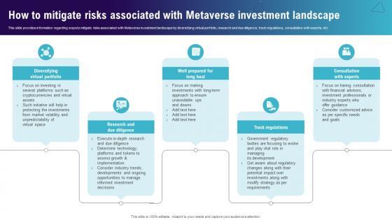 This slide provides information regarding ways to mitigate risks associated with Metaverse investment landscape by diversifying virtual portfolio, research and due diligence, track regulations, consultation with experts, etc. Do you know about Slidesgeeks How To Mitigate Risks Associated With Continuum Of Technology Revamping Business AI SS V These are perfect for delivering any kind od presentation. Using it, create PowerPoint presentations that communicate your ideas and engage audiences. Save time and effort by using our pre-designed presentation templates that are perfect for a wide range of topic. Our vast selection of designs covers a range of styles, from creative to business, and are all highly customizable and easy to edit. Download as a PowerPoint template or use them as Google Slides themes. This slide provides information regarding ways to mitigate risks associated with Metaverse investment landscape by diversifying virtual portfolio, research and due diligence, track regulations, consultation with experts, etc.