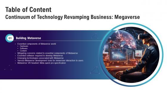 Crafting an eye-catching presentation has never been more straightforward. Let your presentation shine with this tasteful yet straightforward Table Of Content For Continuum Of Technology Revamping Business Megaverse AI SS V template. It offers a minimalistic and classy look that is great for making a statement. The colors have been employed intelligently to add a bit of playfulness while still remaining professional. Construct the ideal Table Of Content For Continuum Of Technology Revamping Business Megaverse AI SS V that effortlessly grabs the attention of your audience Begin now and be certain to wow your customers Our Table Of Content For Continuum Of Technology Revamping Business Megaverse AI SS V are topically designed to provide an attractive backdrop to any subject. Use them to look like a presentation pro.