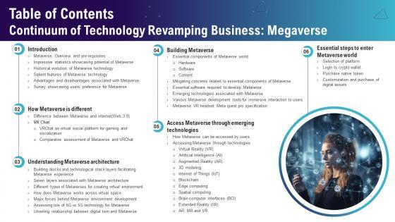 Make sure to capture your audiences attention in your business displays with our gratis customizable Table Of Contents Continuum Of Technology Revamping Business Megaverse AI SS V. These are great for business strategies, office conferences, capital raising or task suggestions. If you desire to acquire more customers for your tech business and ensure they stay satisfied, create your own sales presentation with these plain slides. Our Table Of Contents Continuum Of Technology Revamping Business Megaverse AI SS V are topically designed to provide an attractive backdrop to any subject. Use them to look like a presentation pro.