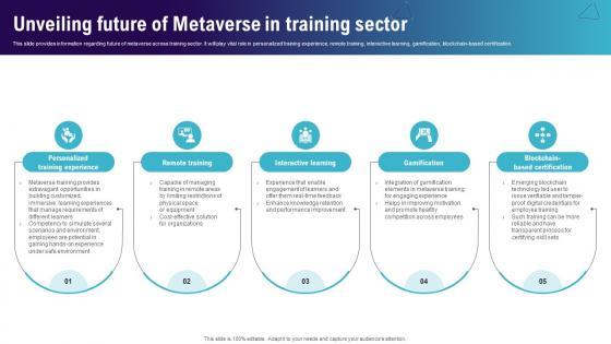 This slide provides information regarding future of metaverse across training sector. It will play vital role in personalized training experience, remote training, interactive learning, gamification, blockchain-based certification. This modern and well-arranged Unveiling Future Of Metaverse In Training Sector Continuum Of Technology Revamping Business AI SS V provides lots of creative possibilities. It is very simple to customize and edit with the Powerpoint Software. Just drag and drop your pictures into the shapes. All facets of this template can be edited with Powerpoint, no extra software is necessary. Add your own material, put your images in the places assigned for them, adjust the colors, and then you can show your slides to the world, with an animated slide included. This slide provides information regarding future of metaverse across training sector. It will play vital role in personalized training experience, remote training, interactive learning, gamification, blockchain-based certification.