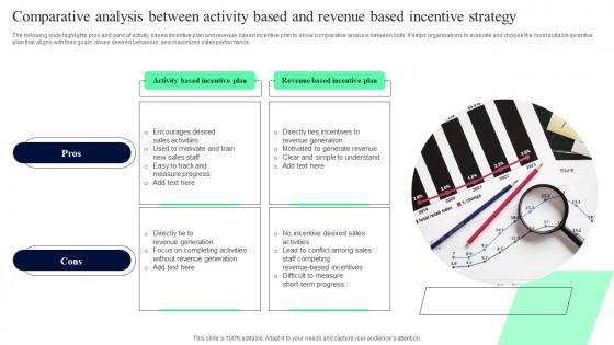 This slide showcasing the strategies to run smoothly the advocacy campaign which assist in determining clear objectives. It includes slogans, logos, buzz on social media, etc. Showcasing this set of slides titled Comparative Analysis Between Activity Based And Revenue Based Incentive Strategy Themes Pdf The topics addressed in these templates are Revenue Generation, Difficult Measure, Directly Incentives All the content presented in this PPT design is completely editable. Download it and make adjustments in color, background, font etc. as per your unique business setting. The following slide highlights pros and cons of activity based incentive plan and revenue based incentive plan to show comparative analysis between both. It helps organizations to evaluate and choose the most suitable incentive plan that aligns with their goals, drives desired behaviors, and maximizes sales performance.