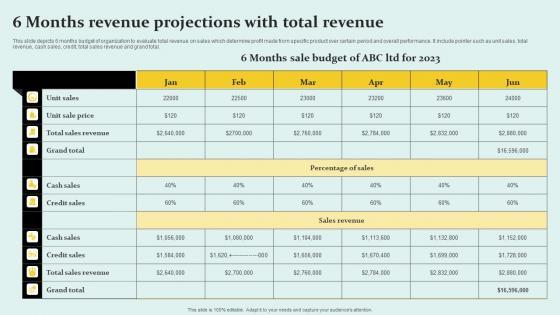 This slide depicts 6 months budget of organization to evaluate total revenue on sales which determine profit made from specific product over certain period and overall performance. It include pointer such as unit sales, total revenue, cash sales, credit, total sales revenue and grand total. Showcasing this set of slides titled 6 Months Revenue Projections With Total Revenue Sample Pdf The topics addressed in these templates are Sales Revenue, Percentage Of Sales, Cash Sales All the content presented in this PPT design is completely editable. Download it and make adjustments in color, background, font etc. as per your unique business setting. This slide depicts 6 months budget of organization to evaluate total revenue on sales which determine profit made from specific product over certain period and overall performance. It include pointer such as unit sales, total revenue, cash sales, credit, total sales revenue and grand total.