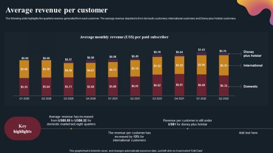 The following slide highlights the quarterly revenue generated from each customer. The average revenue depicted is from domestic customers, international customers and Disney plus Hotstar customers. Are you in need of a template that can accommodate all of your creative concepts This one is crafted professionally and can be altered to fit any style. Use it with Google Slides or PowerPoint. Include striking photographs, symbols, depictions, and other visuals. Fill, move around, or remove text boxes as desired. Test out color palettes and font mixtures. Edit and save your work, or work with colleagues. Download Video Streaming Technology Company Introduction Average Revenue Per Customer Template PDF and observe how to make your presentation outstanding. Give an impeccable presentation to your group and make your presentation unforgettable.