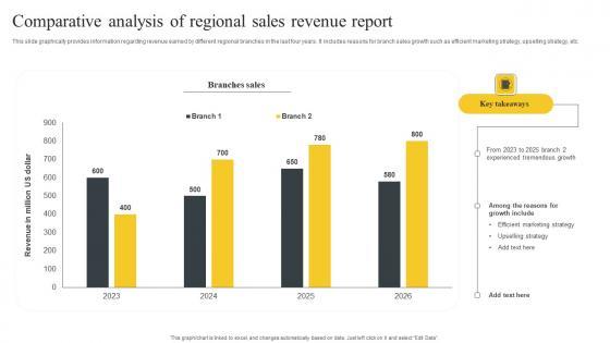 This slide graphically provides information regarding revenue earned by different regional branches in the last four years. It includes reasons for branch sales growth such as efficient marketing strategy, upselling strategy, etc. Showcasing this set of slides titled Comparative Analysis Of Regional Sales Revenue Report Inspiration Pdf. The topics addressed in these templates are Sales Revenue Report. All the content presented in this PPT design is completely editable. Download it and make adjustments in color, background, font etc. as per your unique business setting. This slide graphically provides information regarding revenue earned by different regional branches in the last four years. It includes reasons for branch sales growth such as efficient marketing strategy, upselling strategy, etc.
