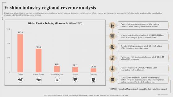 The purpose of this slide is to provide a comprehensive regional outlook of fashion business. It contains information about different nations and the revenues generated by the fashion sector, pointing out the major fashion-producing nations and their corresponding rankings Make sure to capture your audiences attention in your business displays with our gratis customizable Fashion Industry Regional Revenue Analysis Fashion Startup Roadmap Plan Ppt Template BP SS V These are great for business strategies, office conferences, capital raising or task suggestions. If you desire to acquire more customers for your tech business and ensure they stay satisfied, create your own sales presentation with these plain slides. The purpose of this slide is to provide a comprehensive regional outlook of fashion business. It contains information about different nations and the revenues generated by the fashion sector, pointing out the major fashion-producing nations and their corresponding rankings