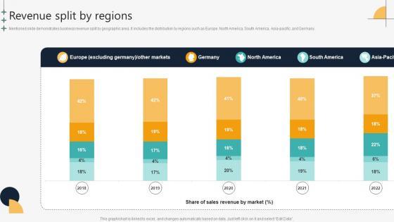 Mentioned slide demonstrates business revenue split by geographic area. It includes the distribution by regions such as Europe. North America, South America, Asia-pacific, and Germany. Do you know about Slidesgeeks Revenue Split By Regions Automotive Manufacturing Company Profile CP SS V These are perfect for delivering any kind od presentation. Using it, create PowerPoint presentations that communicate your ideas and engage audiences. Save time and effort by using our pre-designed presentation templates that are perfect for a wide range of topic. Our vast selection of designs covers a range of styles, from creative to business, and are all highly customizable and easy to edit. Download as a PowerPoint template or use them as Google Slides themes. Mentioned slide demonstrates business revenue split by geographic area. It includes the distribution by regions such as Europe. North America, South America, Asia-pacific, and Germany.