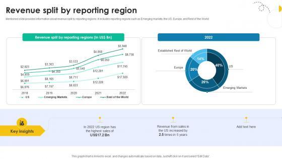 Mentioned slide provides information about revenue split by reporting regions. It includes reporting regions such as Emerging markets, the US, Europe, and Rest of the World. Create an editable Revenue Split By Reporting Region Medical Research And Development Company Profile CP SS V that communicates your idea and engages your audience. Whether you are presenting a business or an educational presentation, pre-designed presentation templates help save time. Revenue Split By Reporting Region Medical Research And Development Company Profile CP SS V is highly customizable and very easy to edit, covering many different styles from creative to business presentations. Slidegeeks has creative team members who have crafted amazing templates. So, go and get them without any delay. Mentioned slide provides information about revenue split by reporting regions. It includes reporting regions such as Emerging markets, the US, Europe, and Rest of the World.