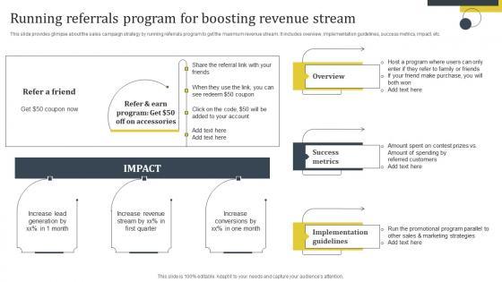 This slide provides glimpse about the sales campaign strategy by running referrals program to get the maximum revenue stream. It includes overview, implementation guidelines, success metrics, impact, etc. Slidegeeks has constructed Enhance Customer Retention Running Referrals Program For Boosting Revenue Stream Diagrams Pdf after conducting extensive research and examination. These presentation templates are constantly being generated and modified based on user preferences and critiques from editors. Here, you will find the most attractive templates for a range of purposes while taking into account ratings and remarks from users regarding the content. This is an excellent jumping-off point to explore our content and will give new users an insight into our top-notch PowerPoint Templates. This slide provides glimpse about the sales campaign strategy by running referrals program to get the maximum revenue stream. It includes overview, implementation guidelines, success metrics, impact, etc.