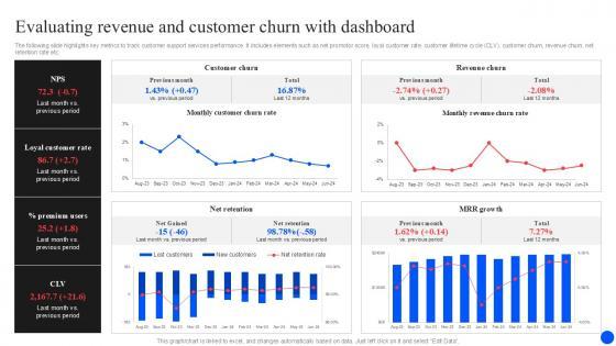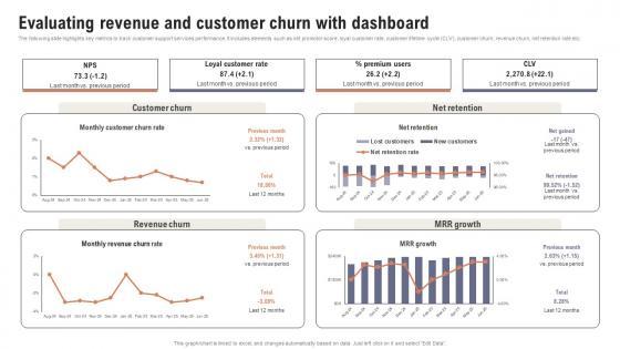 The following slide highlights key metrics to track customer support services performance. It includes elements such as net promotor score, loyal customer rate, customer lifetime cycle CLV, customer churn, revenue churn, net retention rate etc. Find highly impressive Evaluating Revenue And Customer Churn Improving Customer Retention PPT Sample on Slidegeeks to deliver a meaningful presentation. You can save an ample amount of time using these presentation templates. No need to worry to prepare everything from scratch because Slidegeeks experts have already done a huge research and work for you. You need to download Evaluating Revenue And Customer Churn Improving Customer Retention PPT Sample for your upcoming presentation. All the presentation templates are 100 percent editable and you can change the color and personalize the content accordingly. Download now The following slide highlights key metrics to track customer support services performance. It includes elements such as net promotor score, loyal customer rate, customer lifetime cycle CLV, customer churn, revenue churn, net retention rate etc.