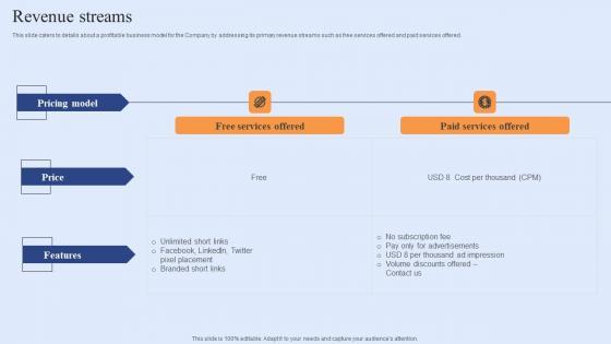 This slide caters to details about a profitable business model for the Company by addressing its primary revenue streams such as free services offered and paid services offered. Do you have to make sure that everyone on your team knows about any specific topic I yes, then you should give Revenue Streams Funding Elevator Pitch Deck For Customer Retention Software Background Pdf a try. Our experts have put a lot of knowledge and effort into creating this impeccable Revenue Streams Funding Elevator Pitch Deck For Customer Retention Software Background Pdf. You can use this template for your upcoming presentations, as the slides are perfect to represent even the tiniest detail. You can download these templates from the Slidegeeks website and these are easy to edit. So grab these today This slide caters to details about a profitable business model for the Company by addressing its primary revenue streams such as free services offered and paid services offered.