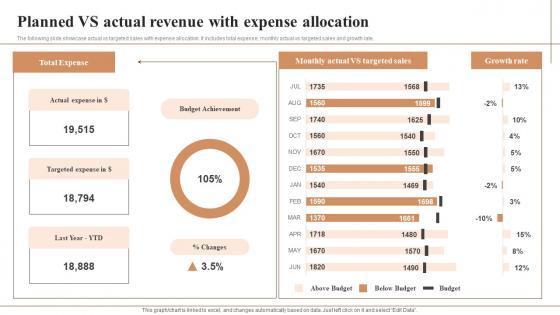 The following slide showcase actual vs targeted sales with expense allocation. It includes total expense, monthly actual vs targeted sales and growth rate. Showcasing this set of slides titled Planned Vs Actual Revenue With Expense Allocation Professional Pdf The topics addressed in these templates are Targeted Sales, Growth Rate, Budget Achievement All the content presented in this PPT design is completely editable. Download it and make adjustments in color, background, font etc. as per your unique business setting. The following slide showcase actual vs targeted sales with expense allocation. It includes total expense, monthly actual vs targeted sales and growth rate.