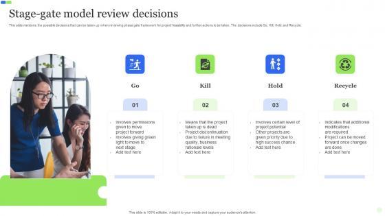 This slide mentions the possible decisions that can be taken up when reviewing phase gate framework for project feasibility and further actions to be taken. The decisions include Go, Kill, Hold and Recycle. Pitch your topic with ease and precision using this Stage Gate Model Review Decisions Topics Pdf. This layout presents information on Stage Gate Model Review, Gate Framework, Project Feasibility. It is also available for immediate download and adjustment. So, changes can be made in the color, design, graphics or any other component to create a unique layout. This slide mentions the possible decisions that can be taken up when reviewing phase gate framework for project feasibility and further actions to be taken. The decisions include Go, Kill, Hold and Recycle.