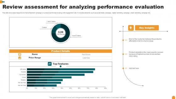 This slide showcase impact level of advertisement campaign on product performance along with engagement rate. It includes elements such as social media campaign, digital marketing campaign, email marketing campaign etc.Showcasing this set of slides titled Review Assessment For Analyzing Performance Evaluation Guidelines Pdf The topics addressed in these templates are Customer Believes, Affordable Terms, Product Reliability All the content presented in this PPT design is completely editable. Download it and make adjustments in color, background, font etc. as per your unique business setting. This slide showcase impact level of advertisement campaign on product performance along with engagement rate. It includes elements such as social media campaign, digital marketing campaign, email marketing campaign etc.