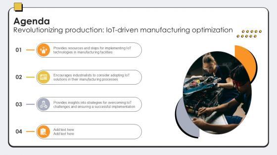 Create an editable Agenda Revolutionizing Production IoT Driven Manufacturing Ppt Example that communicates your idea and engages your audience. Whether you are presenting a business or an educational presentation, pre-designed presentation templates help save time. Agenda Revolutionizing Production IoT Driven Manufacturing Ppt Example is highly customizable and very easy to edit, covering many different styles from creative to business presentations. Slidegeeks has creative team members who have crafted amazing templates. So, go and get them without any delay. Our Agenda Revolutionizing Production IoT Driven Manufacturing Ppt Example are topically designed to provide an attractive backdrop to any subject. Use them to look like a presentation pro.