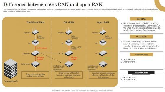 This slide represents the difference between the 5G virtualized random access network and open random access network, including the components of traditional RAN, vRAN, and open RAN. The components include antennas, radio, centralized, and distributed units. Want to ace your presentation in front of a live audience Our Difference Between 5G Vran And Open Ran Revolutionizing Mobile Networks Clipart PDF can help you do that by engaging all the users towards you. Slidegeeks experts have put their efforts and expertise into creating these impeccable powerpoint presentations so that you can communicate your ideas clearly. Moreover, all the templates are customizable, and easy-to-edit and downloadable. Use these for both personal and commercial use. This slide represents the difference between the 5G virtualized random access network and open random access network, including the components of traditional RAN, vRAN, and open RAN. The components include antennas, radio, centralized, and distributed units.