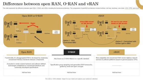 This slide represents the difference between open RAN, O-RAN, and vRAN, including the functional architecture. The components of openRAN architecture include fronthaul, mid haul, backhaul, core node, O-RU, CPRI, and so on. There are so many reasons you need a Difference Between Open Ran O Ran And Revolutionizing Mobile Networks Designs PDF. The first reason is you can not spend time making everything from scratch, Thus, Slidegeeks has made presentation templates for you too. You can easily download these templates from our website easily. This slide represents the difference between open RAN, O-RAN, and vRAN, including the functional architecture. The components of openRAN architecture include fronthaul, mid haul, backhaul, core node, O-RU, CPRI, and so on.