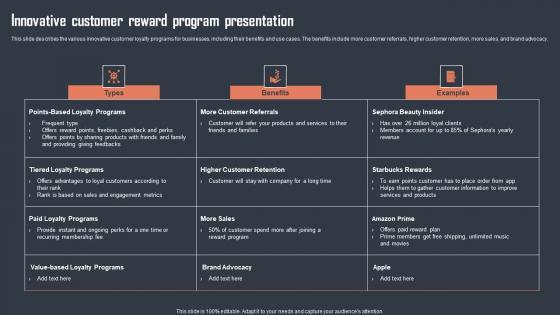 This slide describes the various innovative customer loyalty programs for businesses, including their benefits and use cases. The benefits include more customer referrals, higher customer retention, more sales, and brand advocacy. Pitch your topic with ease and precision using this Innovative Customer Reward Program Presentation Designs Pdf. This layout presents information on Types, Benefits, Examples. It is also available for immediate download and adjustment. So, changes can be made in the color, design, graphics or any other component to create a unique layout. This slide describes the various innovative customer loyalty programs for businesses, including their benefits and use cases. The benefits include more customer referrals, higher customer retention, more sales, and brand advocacy.