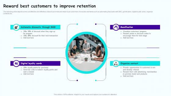 The following slide depicts some cost effective and effortless ideas to promote and retain loyal customers. It includes elements such as automating discounts with SMS, gamification, digital loyalty cards, organize contests etc. Do you know about Slidesgeeks Mobile Ad Campaign Launch Strategy Reward Best Customers To Improve Retention Pictures Pdf These are perfect for delivering any kind od presentation. Using it, create PowerPoint presentations that communicate your ideas and engage audiences. Save time and effort by using our pre-designed presentation templates that are perfect for a wide range of topic. Our vast selection of designs covers a range of styles, from creative to business, and are all highly customizable and easy to edit. Download as a PowerPoint template or use them as Google Slides themes. The following slide depicts some cost effective and effortless ideas to promote and retain loyal customers. It includes elements such as automating discounts with SMS, gamification, digital loyalty cards, organize contests etc.
