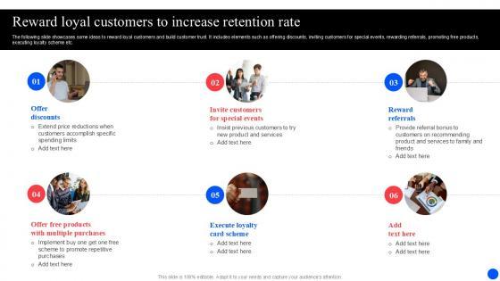 The following slide showcases some ideas to reward loyal customers and build customer trust. It includes elements such as offering discounts, inviting customers for special events, rewarding referrals, promoting free products, executing loyalty scheme etc. The Reward Loyal Customers To Increase Improving Customer Retention PPT Presentation is a compilation of the most recent design trends as a series of slides. It is suitable for any subject or industry presentation, containing attractive visuals and photo spots for businesses to clearly express their messages. This template contains a variety of slides for the user to input data, such as structures to contrast two elements, bullet points, and slides for written information. Slidegeeks is prepared to create an impression. The following slide showcases some ideas to reward loyal customers and build customer trust. It includes elements such as offering discounts, inviting customers for special events, rewarding referrals, promoting free products, executing loyalty scheme etc.